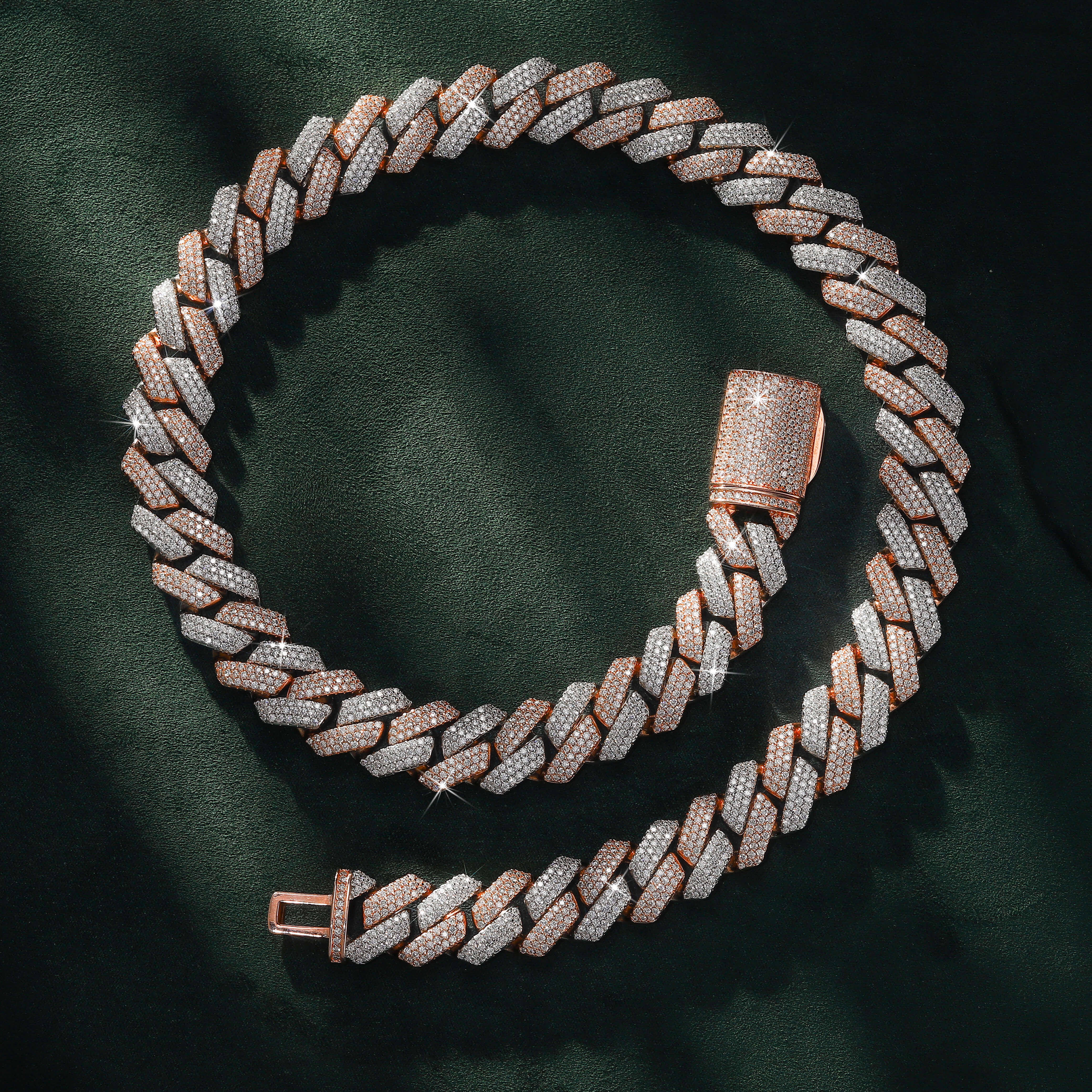 Sommarnox exclusive 115mm Two-Tone Rose Gold & White Gold Three-Row Moissanite Cuban Chain is now available, made of 925 sterling silver and PVD plated with a thick layer of 14K Gold .