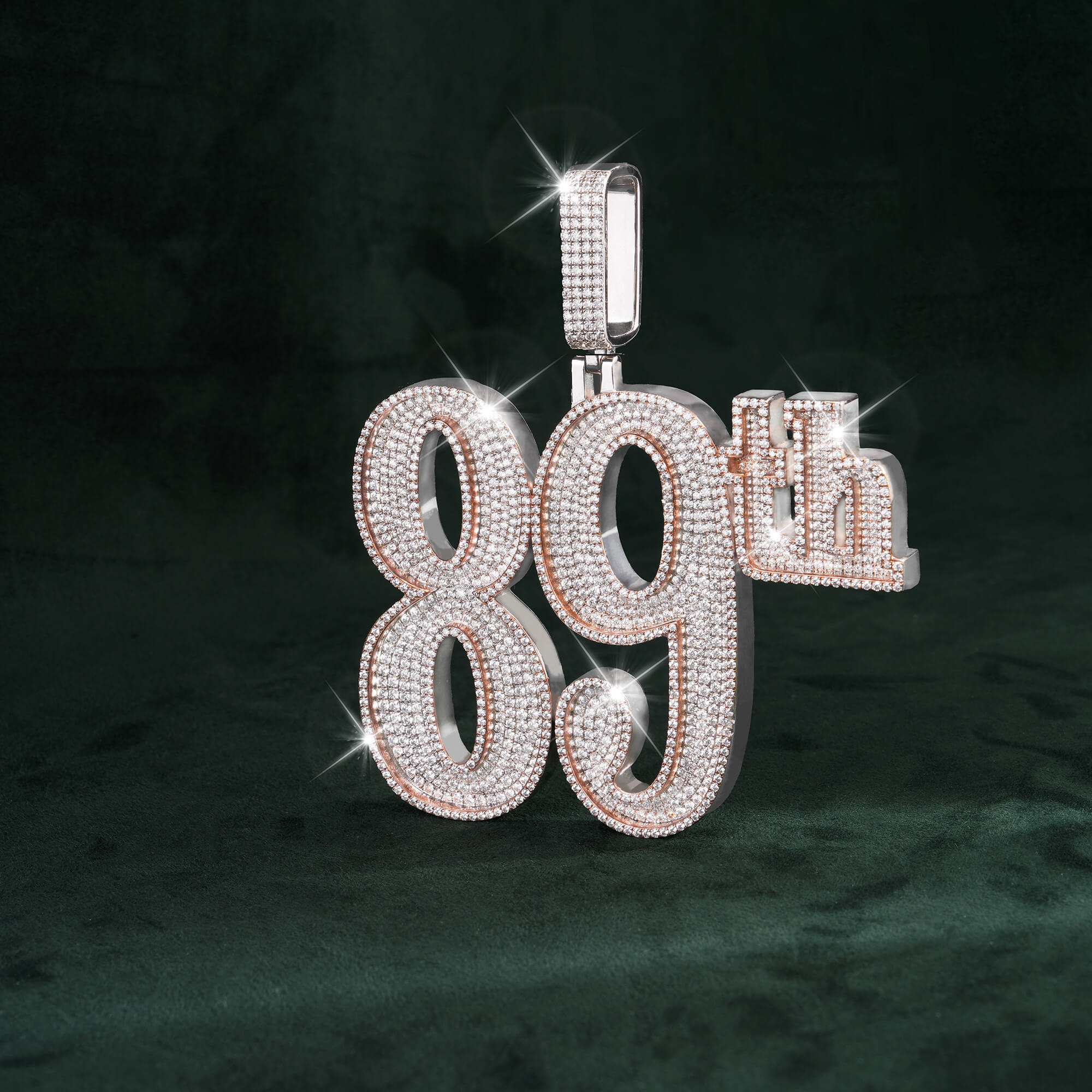 Sommarnox exclusive —Custom “89th” 14K Rose Gold Number Pendant  fully iced for a bold statement. Crafted in 925 sterling silver and PVD plated with a thick layer of 14K gold for a rich, long-lasting gold finish.