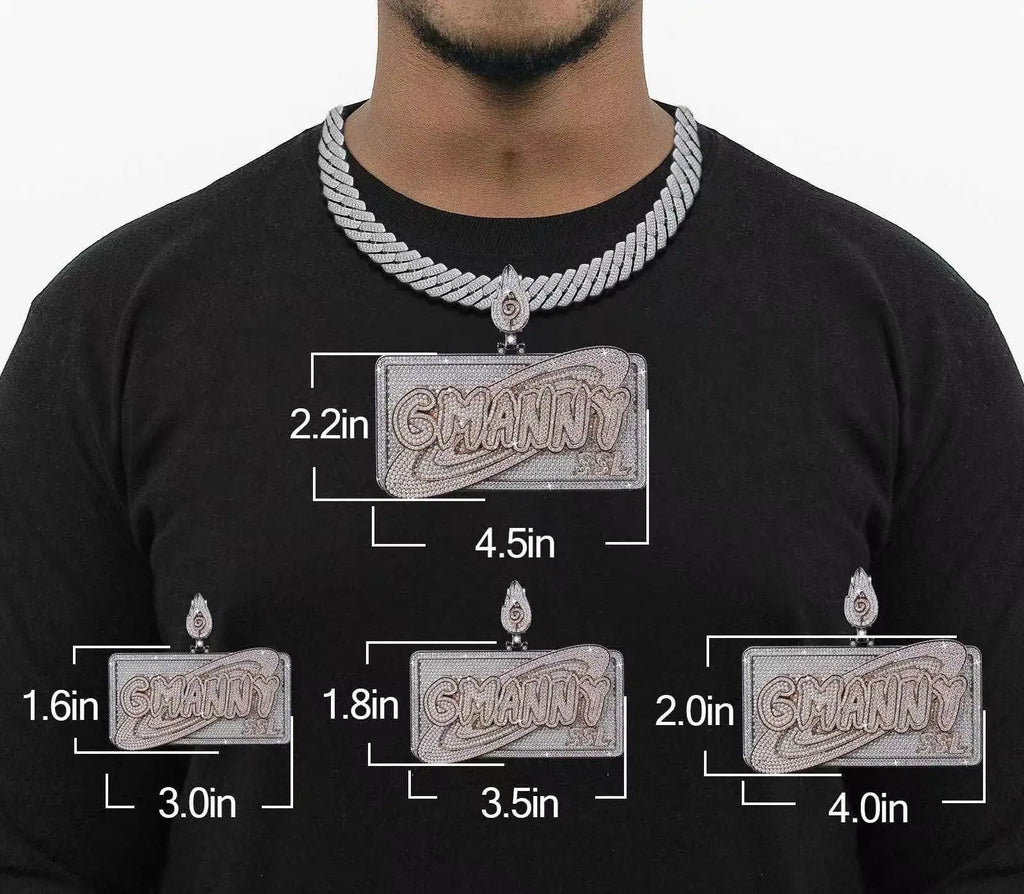 See how our rectangular nameplate pendant sizes look on-body—from 1.6×3.0" to 2.2×4.5". Bigger sizes give a louder, bolder statement, while smaller sizes stay clean and everyday. Choose your fit based on your style and chain thickness.